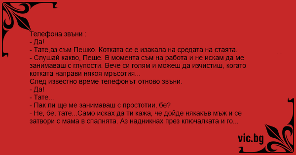- Тате,аз съм Пешко. Котката се е изакала на средата на стаята.