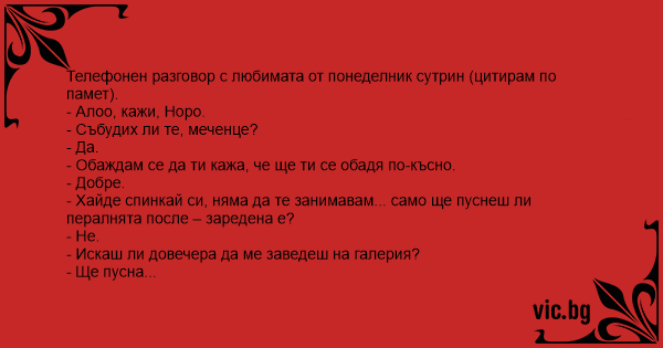 Телефонен разговор с любимата от понеделник сутрин (цитирам по памет).