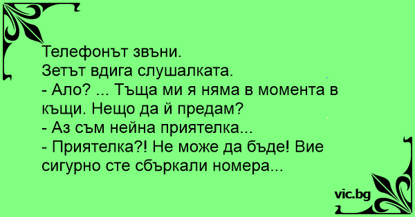 - Ало? ... Тъща ми я няма в момента в къщи. Нещо да й предам?