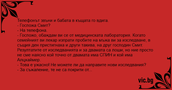 - Госпожо, обаждам ви се от медицинската лаборатория. Когато семейният ви лекар изпрати пробите на мъжа ви за изследване, в същия ден пристигнаха и други такива, на друг господин Смит. Резултатите от изследванията и за двамата са лоши, но ние просто не сме наясно кой точно от двамата има СПИН и кой има Алцхаймер.