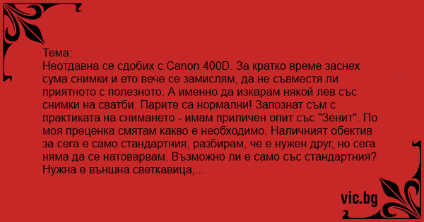 Неотдавна се сдобих с Canon 400D. За кратко време заснех сума снимки и ето вече се замислям, да не съвместя ли приятното с полезното. А именно да изкарам някой лев със снимки на сватби. Парите са нормални! Запознат съм с практиката на снимането - имам приличен опит със "Зенит". По моя преценка смятам какво е необходимо. Наличният обектив за сега е само стандартния, разбирам, че е нужен друг, но сега няма да се натоварвам. Възможно ли е само със стандартния? Нужна е външна светкавица, предполагам за ххх лв., препоръчайте каква най-добре да взема. Допълнителна карта за памет и акумулатор ще купя. Какво още е нужно? Статив с "кабел" - не знам, по мое мнение, не е задължително.