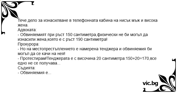 - Обвиняемият при ръст 150 сантиметра,физически не би могъл да изнасили жена,която е с ръст 190 сантиметра!