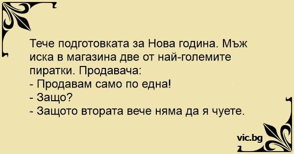 Тече подготовката за Нова година. Мъж иска в магазина две от най-големите пиратки. Продавача: