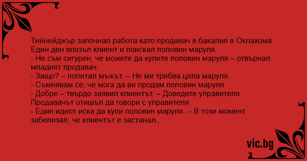 - Един идиot иска да купи половин маруля. – В този момент забелязал, че клиентът е застанал до него. Без да се смути, тийнейджърът продължил: – А този господин иска да купи другата половина.