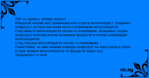 Изведнъж покрай него преминава като стрела велосипедист. Озадачен шофьорът на тира настъпва газта и изпреварва велосипедиста.