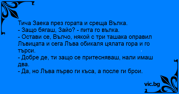 - Остави се, Вълчо, някой с три ташака оправил Лъвицата и сега Лъва обикаля цялата гора и го търси.