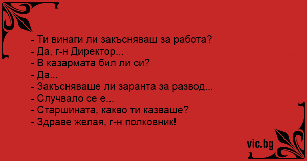 Krause ist wieder mal zu spät gekommen und erhält eine Standpauke vom Chef: "Sie waren ja sicher mal beim Bund. Was hat da eigentlich der Spieß zu Ihnen gesagt, wenn Sie zu spät gekommen sind?" Krause: "Nichts besonderes. Er sagte wie immer: "Guten Morgen, Herr Major!"