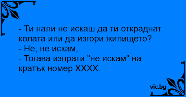 - Ти нали не искаш да ти откраднат колата или да изгори жилището? - Не, не искам, - Тогава изпрати "не искам" на кратък номер XXXX.