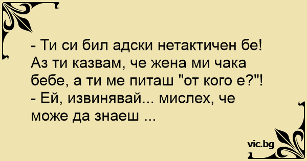 - Ти си бил адски нетактичен бе! Аз ти казвам, че жена ми чака бебе, а ти ме питаш "от кого е?"!
