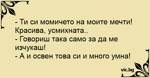 Он: Ти си најсимпатичната, и најубавата девојка што сум ја видел! Она: Ма не сери, само сакаш да ме е*еш или! Он: Ооо, па ти си била и паметна...