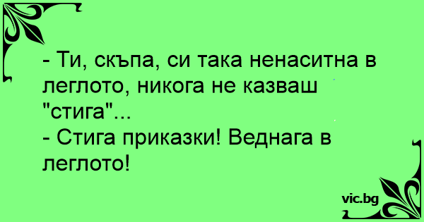 - Ти, скъпа, си така ненаситна в леглото, никога не казваш "стига"...