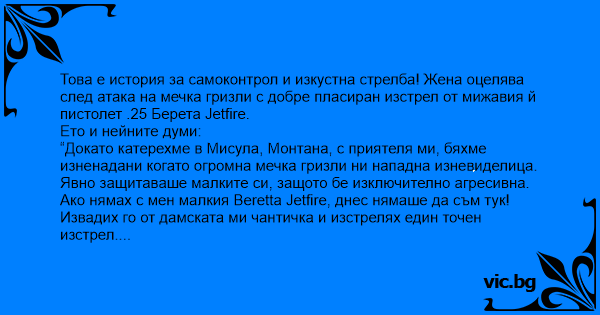Това е история за самоконтрол и изкустна стрелба! Жена оцелява след атака на мечка гризли с добре пласиран изстрел от мижавия й пистолет .25 Берета Jetfire.