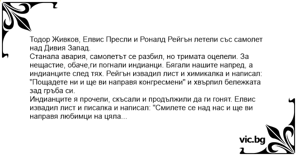 Тодор Живков, Елвис Пресли и Роналд Рейгън летели със самолет над Дивия Запад.