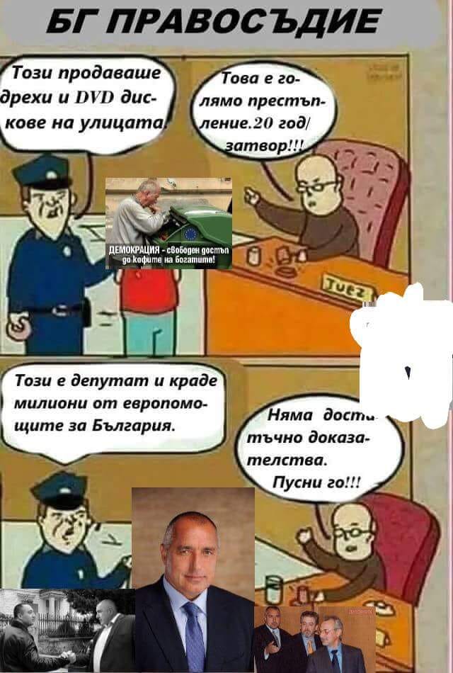 Този продаваше дрехи и DVD дискове на улицата. - Това е голямо престъпление, 20 години затвор. - Този е депутат и краде милиони от европомощите за България. - Няма достатъчно доказателства, пуснете го