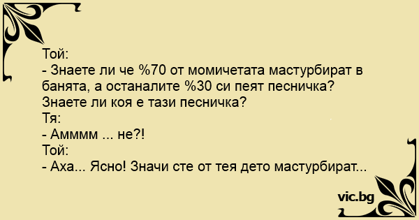 - Знаете ли че %70 от момичетата мастурбират в банята, а останалите %30 си пеят песничка? Знаете ли коя е тази песничка?