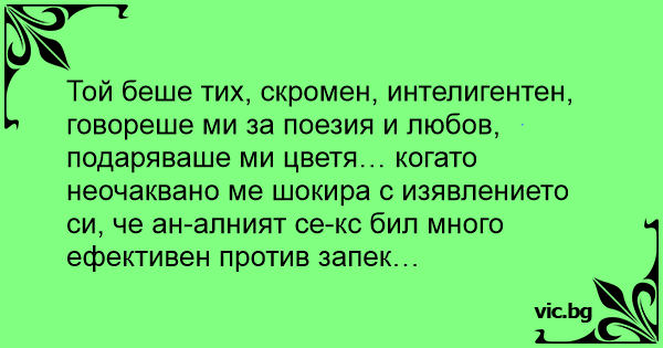 Той беше тих, скромен, интелигентен, говореше ми за поезия и любов, подаряваше ми цветя… когато неочаквано ме шокира с изявлението си, че aнaлнияt cekc бил много ефективен против запек…