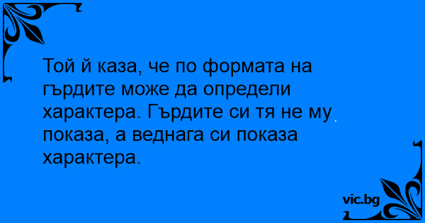 Той й каза, че по формата на гърдите може да определи характера. Гърдите си тя не му показа, а веднага си показа характера.