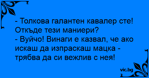 - Вуйчо! Винаги е казвал, че ако искаш да изпраскаш мацка - трябва да си вежлив с нея!