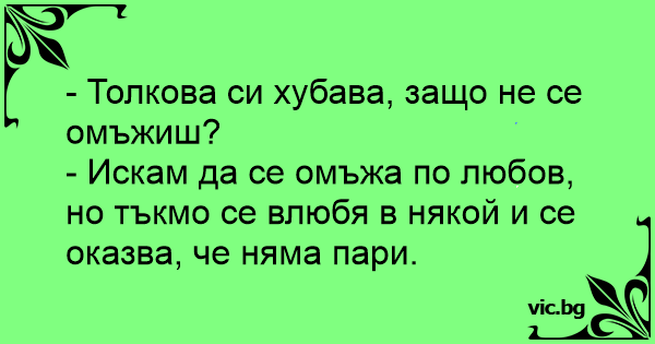 - Искам да се омъжа по любов, но тъкмо се влюбя в някой и се оказва, че няма пари.