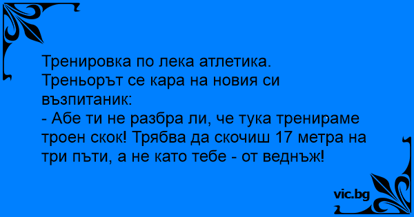 - Абе ти не разбра ли, че тука тренираме троен скок! Трябва да скочиш 17 метра на три пъти, а не като тебе - от веднъж!