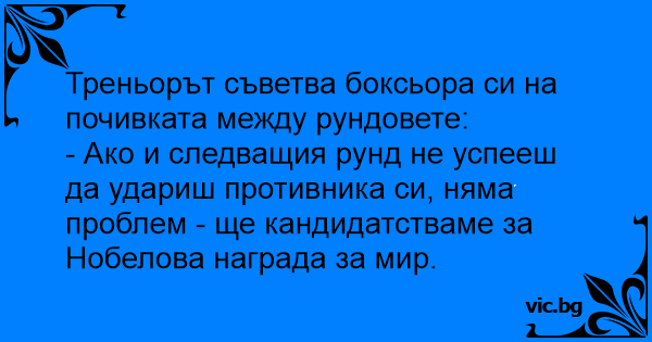 - Ако и следващия рунд не успееш да удариш противника си, няма проблем - ще кандидатстваме за Нобелова награда за мир.