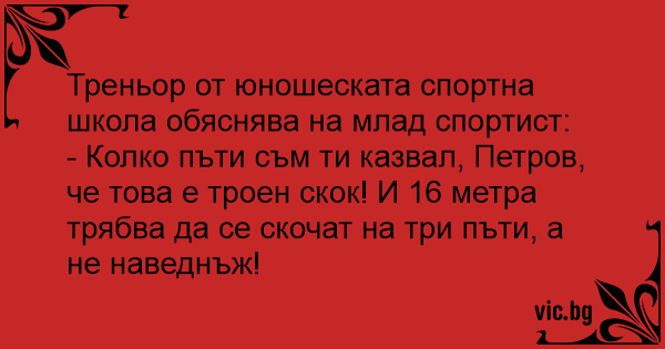- Колко пъти съм ти казвал, Петров, че това е троен скок! И 16 метра трябва да се скочат на три пъти, а не наведнъж!