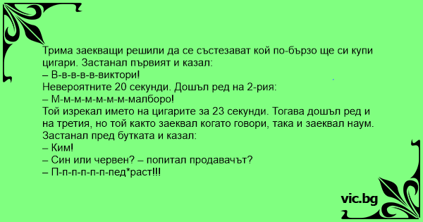 Трима заекващи решили да се състезават кой по-бързо ще си купи цигари. Застанал първият и казал: