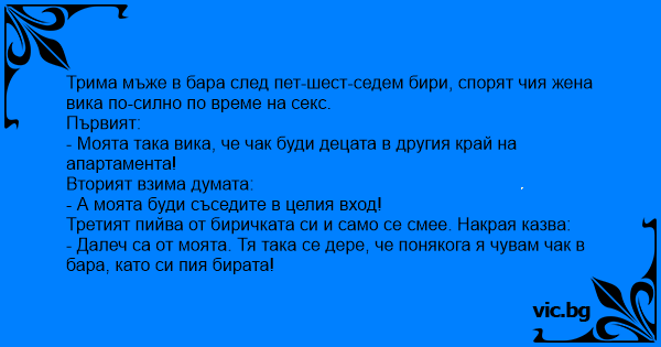 Трима мъже в бара след пет-шест-седем бири, спорят чия жена вика по-силно по време на cеkc.
