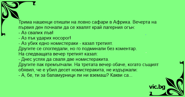 Трима нашенци отишли на ловно сафари в Африка. Вечерта на първия ден почнали да се хвалят край лагерния огън: