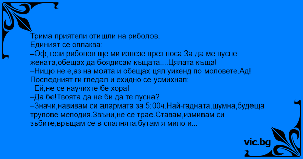 –Значи,навивам си алармата за 5:00ч.Най-гадната,шумна,будеща трупове мелодия.Звъни,не се трае.Ставам,измивам си зъбите,връщам се в спалнята,бутам я мило и прошепвам:„Мила,ще правим ли cekc или да вървя за риба?"Само измрънка:„Да не си забравиш стръвта"....