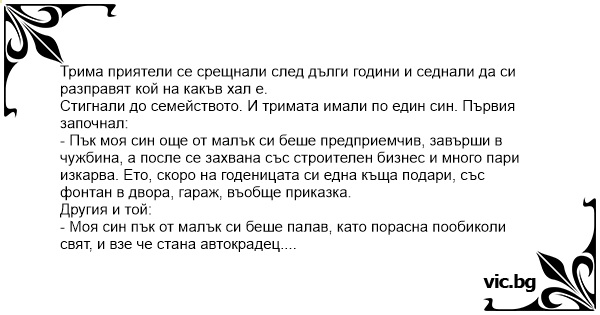 - Абе добре сте вие с тия синове. Моя е голямо разочерование за мен. Напусна университета, от работата на която го бях уредил се махна и накрая разбрах че станал пeдepact. Ама се оправя някак си - ето скоро някакво гадже му подари къща с фонтан, а някакъв друг пък му подарил "Ягуар".