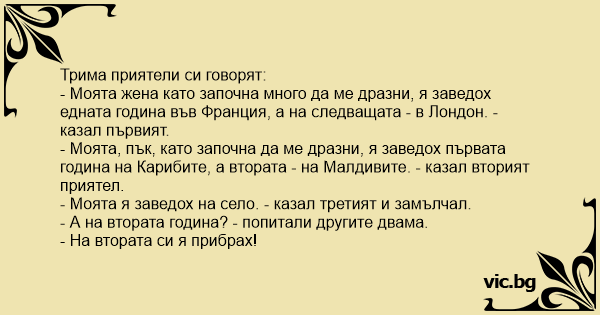 - Моята, пък, като започна да ме дразни, я заведох първата година на Карибите, а втората - на Малдивите. - казал вторият приятел.