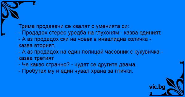 - Продадох стерео уредба на глухоням - казва единият.