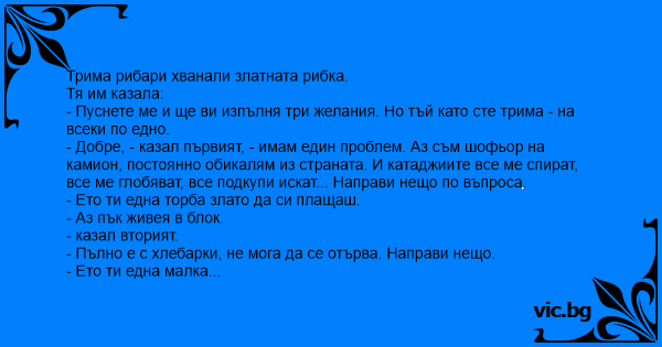 - Пуснете ме и ще ви изпълня три желания. Но тъй като сте трима - на всеки по едно.