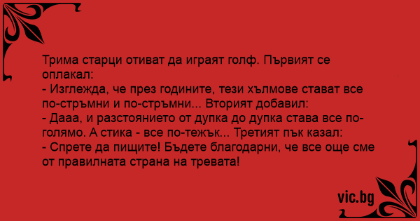 - Дааа, и разстоянието от дупка до дупка става все по-голямо. A стика - все по-тежък... Третият пък казал: