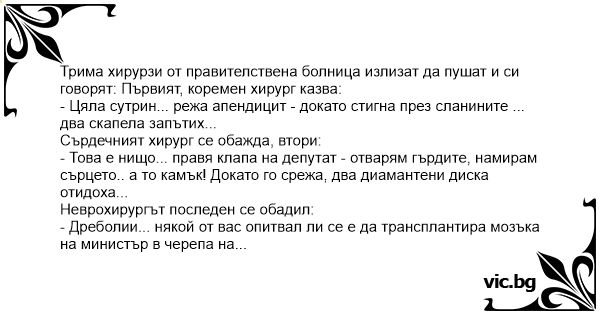 Трима хирурзи от правителствена болница излизат да пушат и си говорят: Първият, коремен хирург казва: