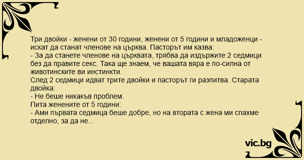 - За да станете членове на църквата, трябва да издържите 2 седмици без да правите cekc. Така ще знаем, че вашата вяра е по-силна от животинските ви инстинкти.