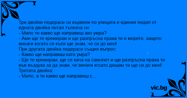 Три двойки педераси си вървели по улицата и единия пeдaл от едната двойка питал тъпкача си: