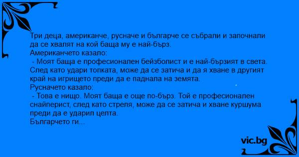- Моят баща е професионален бейзболист и е най-бързият в света. След като удари топката, може да се затича и да я хване в другият край на игрището преди да е паднала на земята.