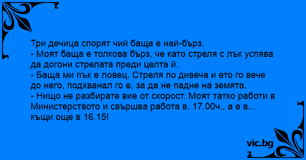 - Нищо не разбирате вие от скорост. Моят татко работи в Министерството и свършва работа в. 17.00ч., а е в... къщи още в 16.15!