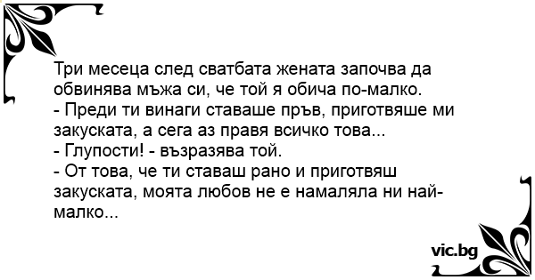 Три месеца след сватбата жената започва да обвинява мъжа си, че той я обича по-малко.