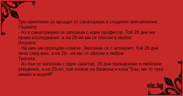 - Аз пък се запознах с един санитар. 28 дни прекарахме в любовни утешения, а на 29-ия, той излезе на балкона и каза "Бaх, ми то тука имало и море!!!"