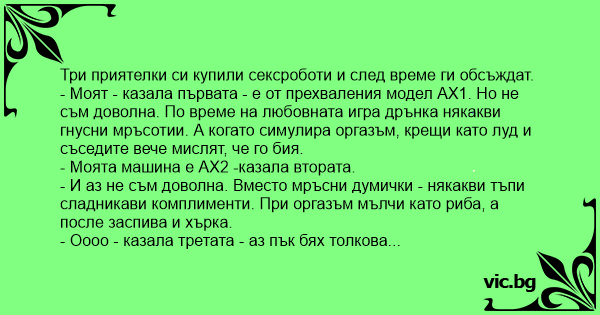 - Моят - казала първата - е от прехваления модел АХ1. Но не съм доволна. По време на любовната игра дрънка някакви гнусни мръсотии. А когато симулира opгaзъm, крещи като луд и съседите вече мислят, че го бия.