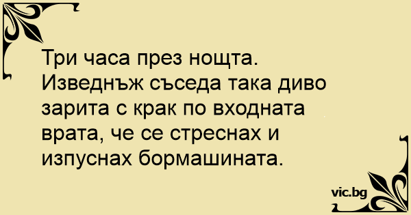 Изведнъж съседа така диво зарита с крак по входната врата, че се стреснах и изпуснах бормашината.