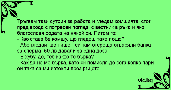 - Абе гледай кво пише - ей там отсреща отваряли банка за cпepma, 50 лв давали за една доза