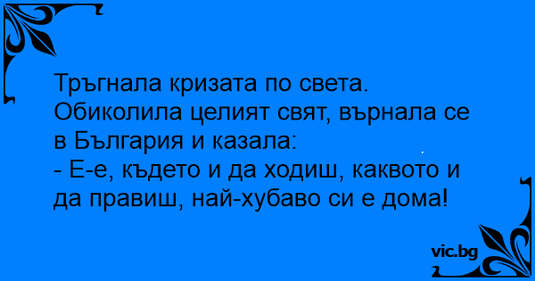 Тръгнала кризата по света. Обиколила целият свят, върнала се в България и казала: