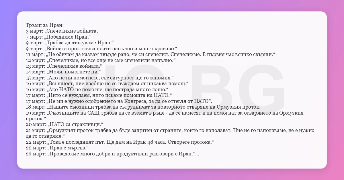 Тръмп за Иран: 3 март: „Спечелихме войната.“ 7 март: „Победихме Иран.“ 9 март: „Трябва да атакуваме Иран.“ 9 март: „Войната приключва почти напълно и много красиво.“ 11 март: „Не обичам да казвам твърде рано, че си спечелил. Спечелихме. В първия час всичко свърши.“ 12 март: „Спечелихме, но все още не сме спечелили напълно.“ 13 март: „Спечелихме войната.“ 14 март: „Моля, помогнете ни.“ 15 март: „Ако не ни помогнете, със сигурност ще го запомня.“ 16 март: „Всъщност, ние изобщо не се нуждаем от никаква помощ.“ 16 март: „Ако НАТО не помогне, ще пострада много лошо.“ 17 март: „Нито се нуждаем, нито искаме помощта на НАТО.“ 17 март: „Не ми е нужно одобрението на Конгреса, за да се оттегля от НАТО". 18 март: „Нашите съюзници трябва да сътрудничат за повторното отваряне на Ормузкия проток.“ 19 март: „Съюзниците на САЩ трябва да се вземат в ръце - да се намесят и да помогнат за отварянето на Ормузкия проток.“ 20 март: „НАТО са страхливци.“ 21 март: „Ормузкият проток трябва да бъде защитен от страните, които го използват. Ние не го използваме, не е нужно да го отваряме.“ 22 март: „Това е последният път. Ще дам на Иран 48 часа. Отворете протока.“ 22 март: „Иран е мъртъв.“ 23 март: „Проведохме много добри и продуктивни разговори с Иран.“ 24 март: „Постигаме напредък.“ 25 март: „Дадоха ни подарък и той пристигна днес. Беше много голям подарък, струващ огромна сума пари. Няма да ви кажа какъв е този подарък, но беше много значителна награда.“ 26 март: „Сключете сделка или просто ще продължим да ви разпръскваме.“ 27 март: „Не е нужно да сме там за НАТО.“ 29 март: "Преговорите напредват." 30 март: „Отворете Ормузкия проток незабавно или ще се изправите пред опустошителни последици.“ 31 март: "Сделката е много близо и Иран ще постъпи правилно“. 1 април: „Ще видим какво ще се случи много скоро.“ 2 април: "Сделката е вероятна, но продължаваме ударите, ако не бъде постигната." 3 април: „Ще се случи нещо голямо.“ 4 април: "Иран трябва да се съобрази незабавно или ще се изправи пред по-нататъшни последици." 5 април: „Отворете протока, луди к*******, или ще живеете в Ада - САМО ГЛЕДАЙТЕ! Слава на Аллах.“ 6 април: "Цялата цивилизация на Иран ще умре тази вечер!"