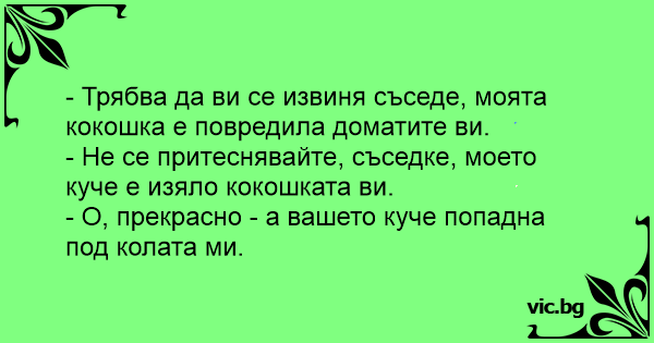 - Не се притеснявайте, съседке, моето куче е изяло кокошката ви.