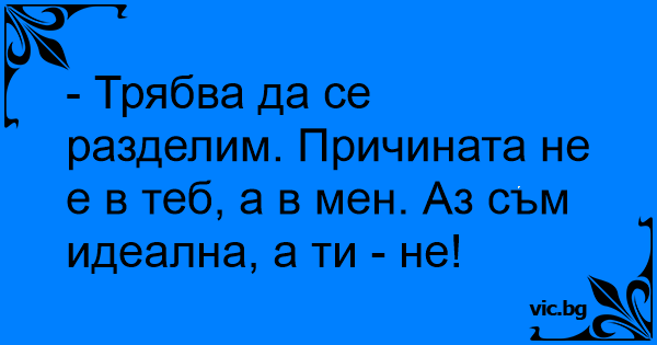 - Трябва да се разделим. Причината не е в теб, а в мен. Аз съм идеална, а ти - не!