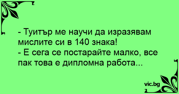 - Туитър ме научи да изразявам мислите си в 140 знака! - Е сега се постарайте малко, все пак това е дипломна работа...